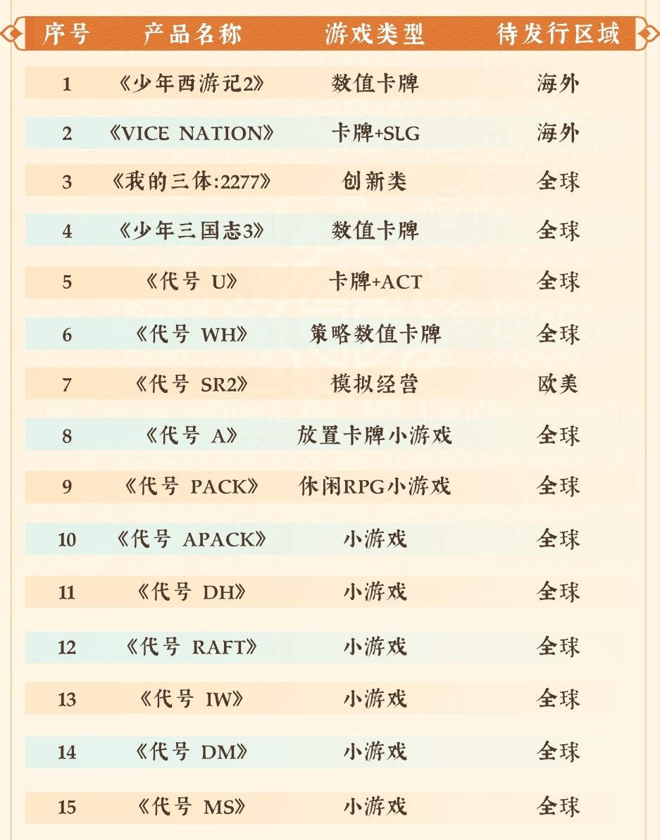 首款《三体》IP正版授权游戏《我的三体::::2277》已开放预约,,,,另有现代都市题材SLG《Vice Nation》、、、少年系列重磅新品《少年三国志3》、、、、模拟经营全平台游戏《代号::::SR2》等产品储备。。此外在小游戏赛道上,,《代号 A》《代号 Pack》《代号 DH》等也将陆续开启测试,,,伴随多款新品的陆续上线有望进一步撬动增长空间。。。