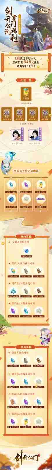 游戏为大家准备了海量的福利,,,,包括上线即可获得的全渠道预约礼包、、、、十连抽等福利,,,,输入密令“JK666”、、、“JK888”即可领取紫色弟子,,,达到金丹期后还有功法宝箱可领,,助力全宗上下实力提升……所有奖励总价值超过648元,,而邀请好友一起体验,,,更可以获得额外的奖励哦~